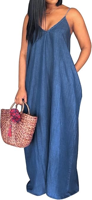 Denim is usually associated with casual looks, but this maxi dress can be gussied up with some sparkly jewelry and heels. Soft and lightweight, it has a plunging V-neckline and adjustable spaghetti straps. If you want to keep things laid-back, just pair it with a baseball cap and sneakers.