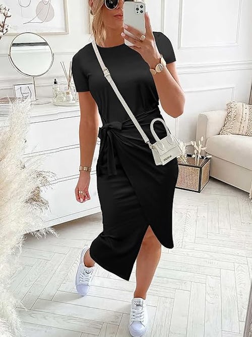 If a wrap dress and T-shirt dress had a child, it would be this cute number. This knee-length dress has a simple crew-neck bodice, while the faux wrap skirt ties at the waist with a sash closure. This creates a ruched effect, which — along with the slit — makes this a super stylish pick.