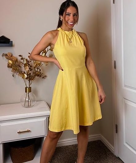 This halter-neck dress brings the party, whether you opt for a wear-everywhere color like black, a bright pop like yellow, or a classic floral print. Made from cotton and spandex, this breathable and stretchy number has a fit-and-flare silhouette, a keyhole closure in back, and ruching at the neckline.