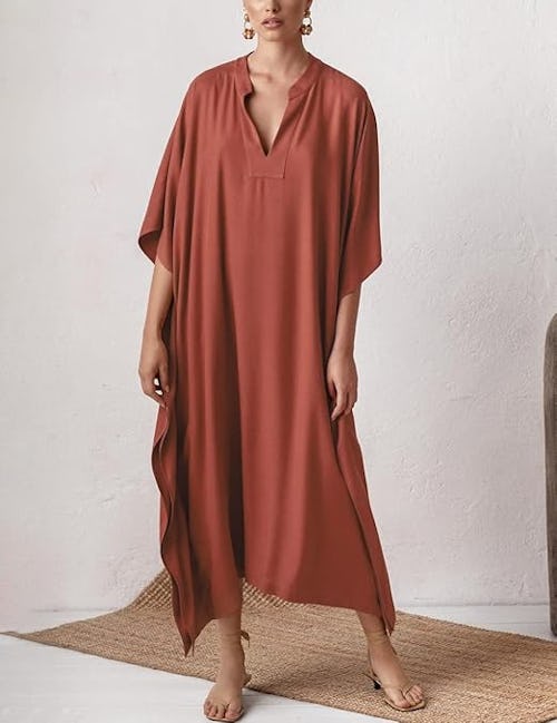 Think sophisticated means stuffy? (And uncomfortable?) This caftan will have you thinking twice. With a notched V-neck and elbow-length dolman sleeves, this dress has a loose, flowy fit that’s definitely comfortable enough for lounging at home. Add a bathing suit underneath for the beach — then drop earrings and heels for a night out.