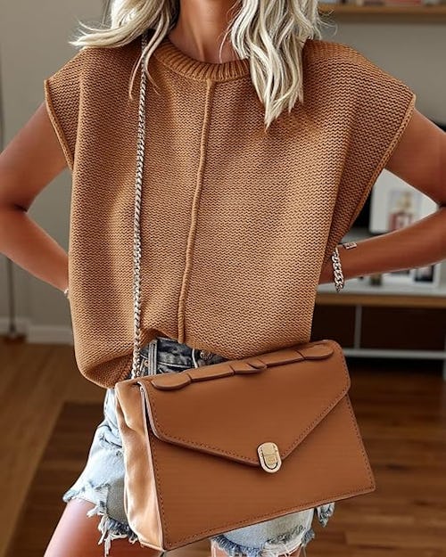 Sweaters aren’t just for cozy weather; this lightweight sweater top won’t overheat, but looks so cute. Made from a soft and breathable cotton and acrylic blend, it has rolled cap sleeves and a slouchy fit. The center seam adds a chic style element.
