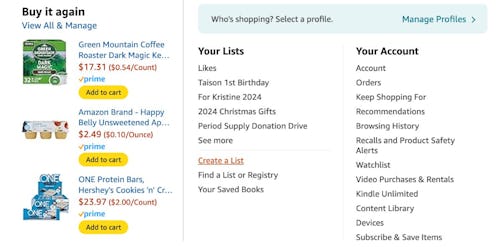 You can create a list by going to the profile icon on the app or by hovering over “Account & Lists” on your desktop.