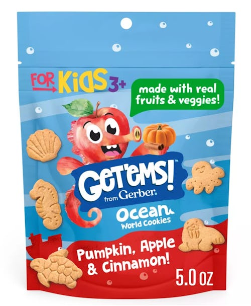 - Get’ems! Ocean World Cookies: Made with iron and essential vitamin E, these ocean-shaped cookies (seashells! Seahorses!) come in two flavors: Kale, Apple & Blueberry and Pumpkin, Apple & Cinnamon.