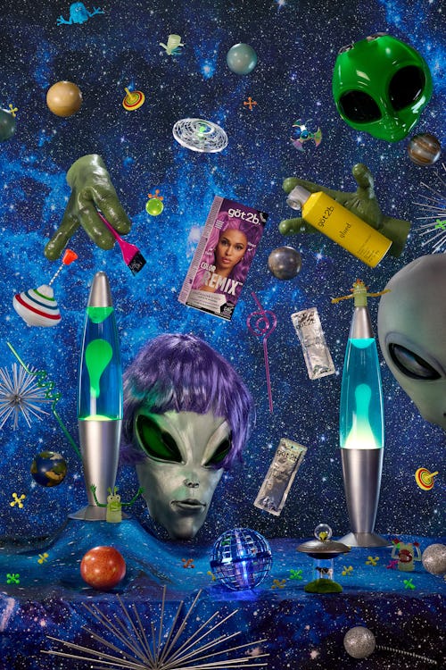 Your journey into outer space has göt to include: A glimmering starship filled with hair of purple hues. Galactic green lava beams point your way through the stars. Along a twisty path stretching from Pluto to Mars.