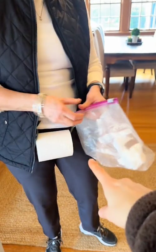 My favorite, however, might be Gigi’s special Toddler Utility belt, which is a roll of toilet paper and a Ziploc on an ordinary belt to quickly address runny noses and booger-filled tissues.